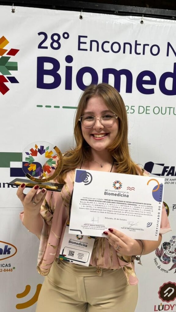 Na categoria Apresentação de Painéis – Graduação, Louise Elias de Carvalho recebeu Menção Honrosa do XV Prêmio Professora Dra. Maria José Queiroz de Freitas Alves, enquanto Mariana Campanha Hilário Pereira obteve o 1º lugar do XXIII Prêmio Professor Dr. Carlos Roberto Rúbio, na Apresentação Oral – Graduação, com seu trabalho de Iniciação Científica.
