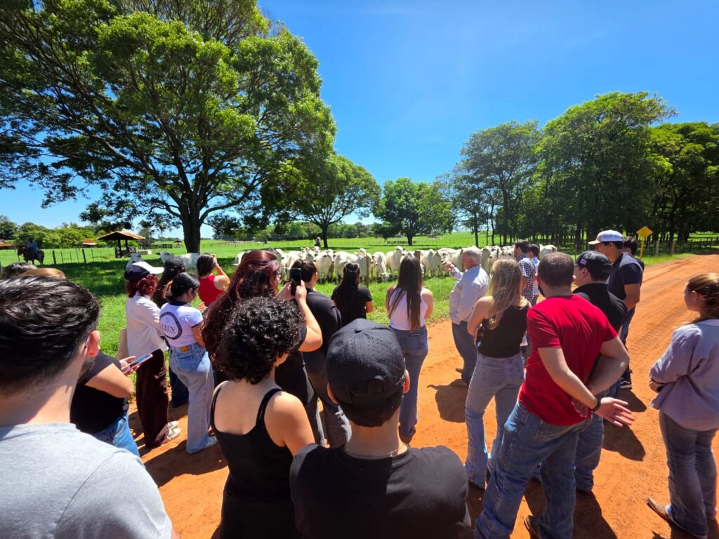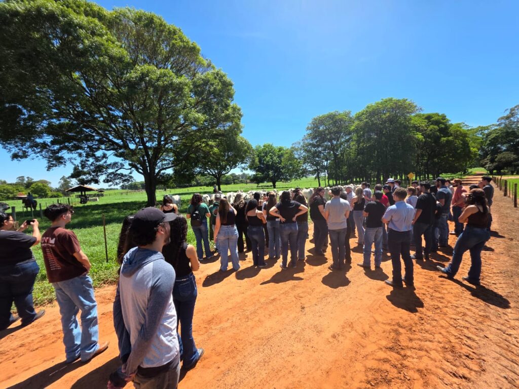 De acordo com o docente, a propriedade integra o programa de melhoramento genético Qualitas, que realiza avaliações rigorosas desde o nascimento do bezerro, medindo desempenho, selecionando machos e fêmeas e acompanhando cada etapa do desenvolvimento dos animais. “Durante a visita, os alunos conheceram o manejo desde o nascimento do bezerro, acompanharam a formação de lotes, entenderam os tipos de inseminação utilizados, observaram o manejo de pastagens, a suplementação e todas as fases do ciclo produtivo, além de percorrerem a fazenda para ver de perto diferentes categorias, como bezerros desmamados, novilhas, garrotes e animais prontos para venda”, explicou.