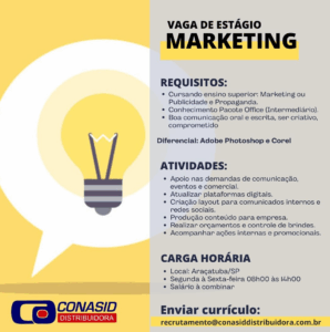 Vaga de estágio destinada aos alunos do curso de ADMINISTRAÇÃO, MARKETING, PUBLICIDADE E PROPAGANDA.