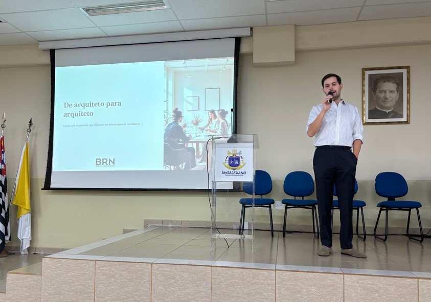 O Curso de Arquitetura e Urbanismo do UniSALESIANO promoveu, no dia 12 de novembro, uma noite de aprendizado e troca profissional. O arquiteto e empreendedor, Bruno Brandini, foi recebido para ministrar a palestra “De arquiteto para Arquiteto”, em um convite que partiu da coordenação, representada pelo Prof. Giuliano Pincerato, aliado à proximidade do palestrante com o Prof. Rogério Ramiro e ao interesse das alunas do 4º termo, que solicitaram sua presença para enriquecer a formação da turma.