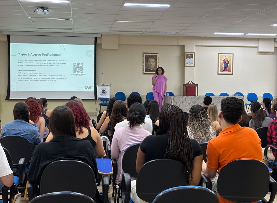 Antes da apresentação principal, os acadêmicos participaram de uma palestra de acolhimento conduzida pela arquiteta, Heloísa Maltarolo, coordenadora regional do CREA-SP – Escritório de São José do Rio Preto. A presença de Heloísa foi articulada pela coordenação e confirmada após ela saber da possibilidade da vinda de Bruno ao câmpus.