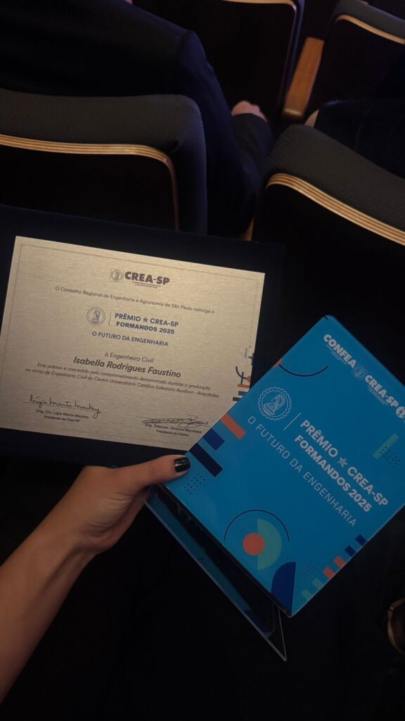 A engenheira civil, Isabella Rodrigues Faustino, de 22 anos, formada pelo UniSALESIANO, foi um dos destaques da 29ª edição do Prêmio CREA-SP de Formação Profissional, realizada recentemente, no Memorial da América Latina. A premiação, promovida pelo CREA-SP – (Conselho Regional de Engenharia e Agronomia do Estado de São Paulo), reconhece os melhores alunos e docentes das áreas de Engenharia, Agronomia e Geociências em todo o Estado.