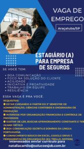 Escolaridade mínima: Médio – Concluído – Obrigatório Experiências e qualificações: Se você: – Possui Ensino Médio completo; – Possui conhecimento em Pacote Office e habilidade com sistemas; Valorizamos também se você: – Possui curso em Administração ou áreas correlatas; – CNH B;