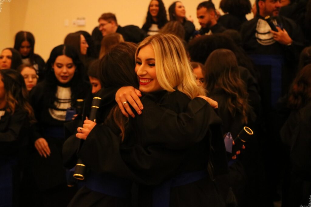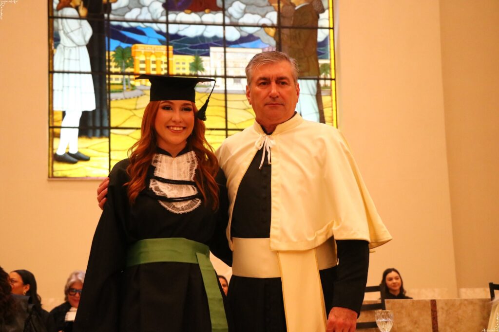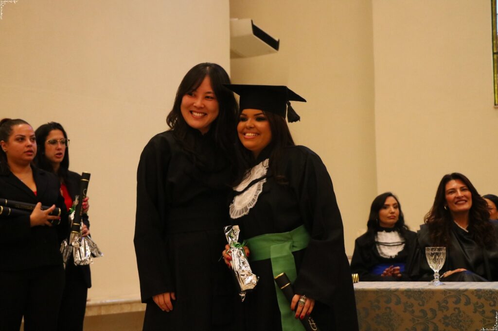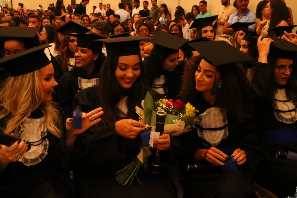 A colação de grau foi marcada pela entrega dos certificados e pela tradicional imposição do chapéu. No Curso de Biomedicina, participaram do momento a paraninfa, Profª. Thaís Verônica Saori Tsousura Chiba, e a patronesse, Profª. Beatriz Batista Trigo. Já no Curso de Psicologia, estiveram à frente o paraninfo, Prof. Ederson Ribeiro Costa, e a patronesse, Profª. Flávia Cristina Santiago de Oliveira.