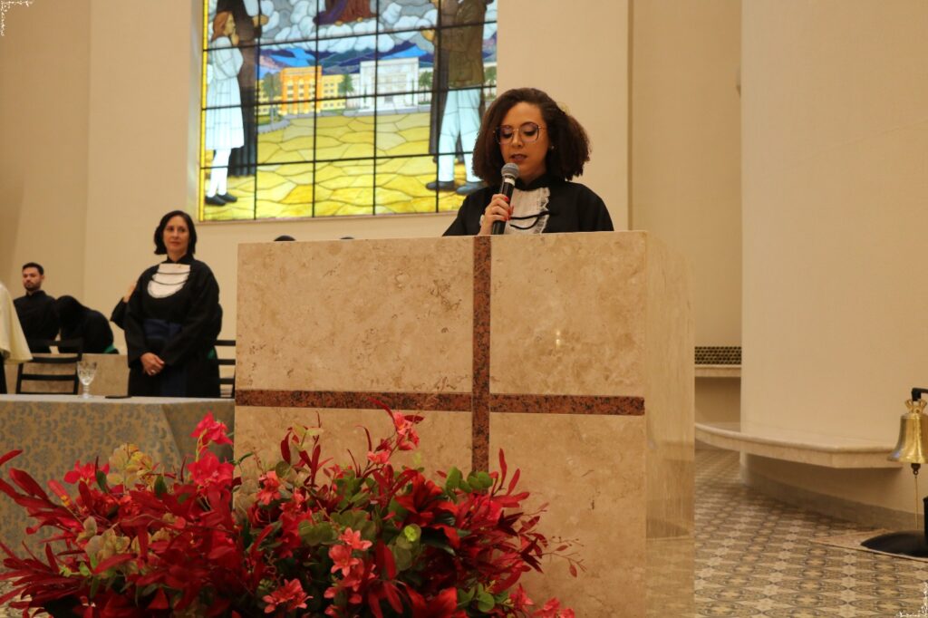Representando os formandos, a biomédica Beatriz Lopes Fani fez uso da palavra e destacou os desafios enfrentados ao longo da graduação, a superação de obstáculos e a importância do apoio recebido dos professores, familiares e da Instituição. Em seguida, a Profª. Thaís Verônica Saori Tsousura Chiba falou em nome dos paraninfos, ressaltando a dedicação e o compromisso dos formandos ao longo da trajetória acadêmica.