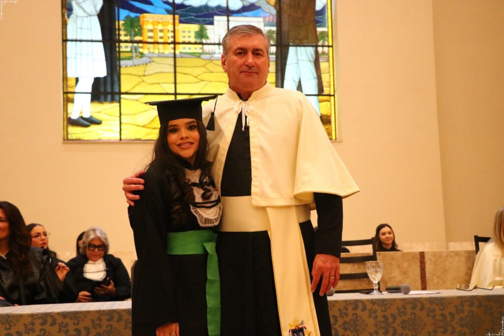 A solenidade também contou com a entrega da Medalha de Honra ao Mérito, concedida aos melhores alunos de cada curso, considerando desempenho acadêmico, postura ética, participação institucional e dedicação aos estudos. Foram homenageadas a acadêmica Isadora Carvalho Araujo, do Curso de Biomedicina, e Désirée Costa Alves Silva, do Curso de Psicologia.