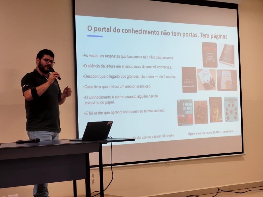 Durante a apresentação, o profissional compartilhou experiências sobre processos produtivos, inovação tecnológica e eficiência operacional, destacando como a integração entre gestão e tecnologia é fundamental para o desenvolvimento das organizações modernas.