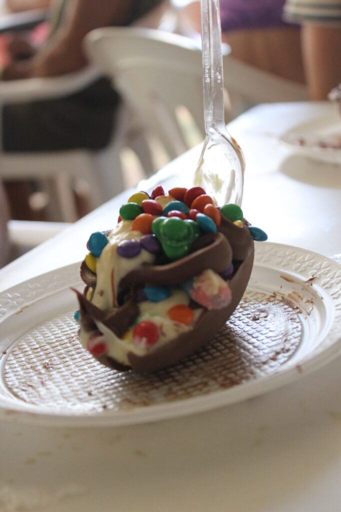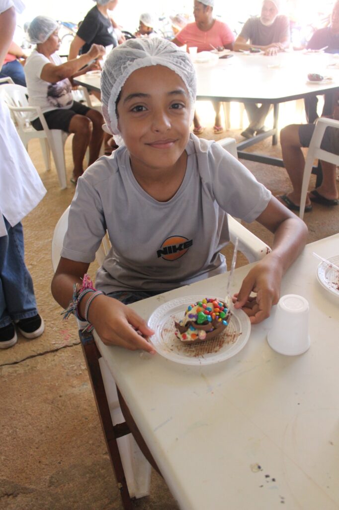 A programação teve início com uma oração de Páscoa, reforçando o verdadeiro sentido da data. Em seguida, os participantes se envolveram na oficina prática, aprendendo a produzir seus próprios ovos de chocolate. Ao final, todos puderam compartilhar um lanche e receberam bombons para levar para casa, prolongando o clima de celebração em família.