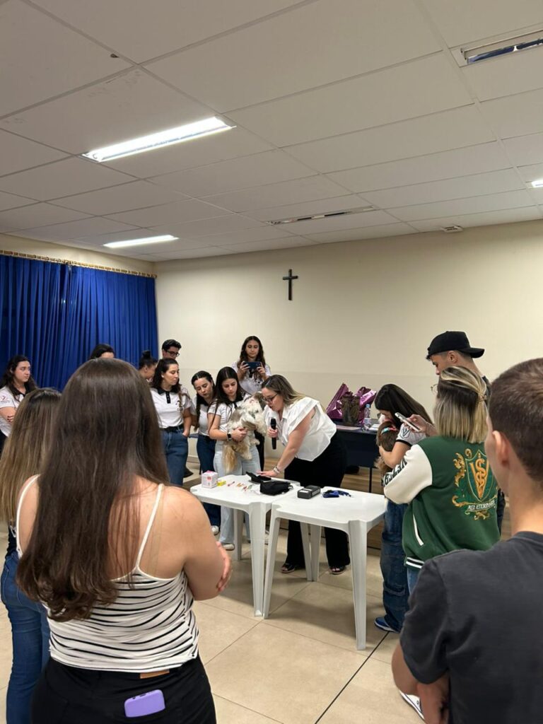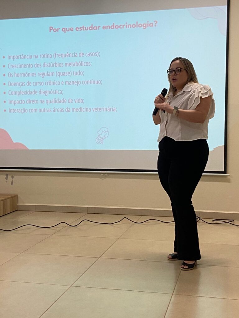 Ao final, a palestrante respondeu a diversas dúvidas dos acadêmicos e reforçou a importância da endocrinologia veterinária como área essencial na formação e na atuação clínica dos futuros profissionais. O encontro proporcionou uma rica troca de conhecimentos e experiências sobre um tema ainda pouco explorado no cotidiano hospitalar, mas de grande relevância para a saúde animal.