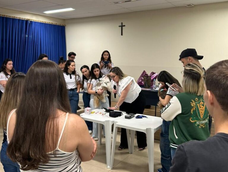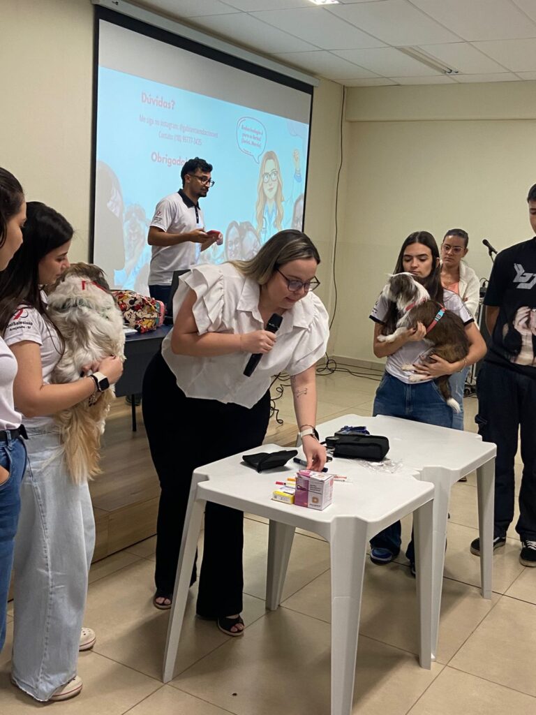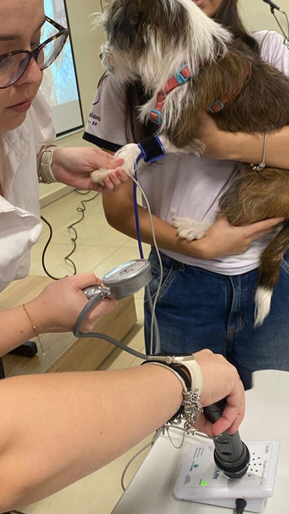 Durante a exposição, a profissional demonstrou procedimentos práticos, como a aferição da pressão arterial em cães utilizando o Doppler, explicando a escolha correta do manguito e o posicionamento adequado do equipamento. Também realizou a medição da glicemia em animais presentes, mostrando o funcionamento do glicosímetro e a forma correta de coleta de sangue.