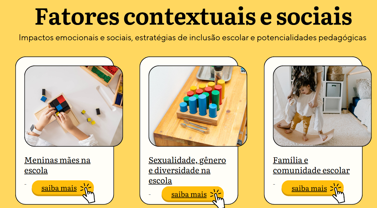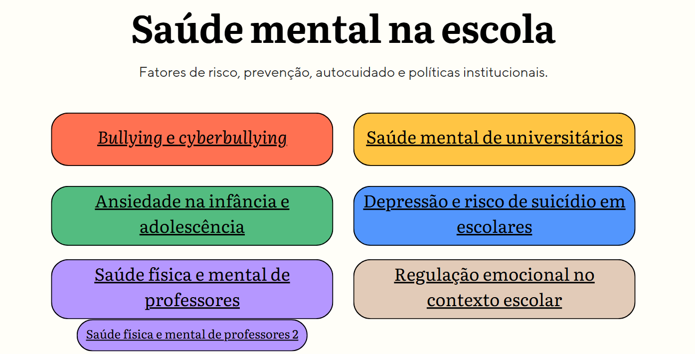 Outro destaque é o espaço dedicado à Saúde Mental na Escola, que aborda bullying e cyberbullying, ansiedade na infância e adolescência, saúde mental de universitários, depressão, risco de suicídio em escolares, regulação emocional e o cuidado com a saúde física e mental dos professores. O site também contempla temas ligados aos fatores contextuais e sociais, como família e comunidade escolar, diversidade, gênero e sexualidade, além da realidade de meninas mães no ambiente educacional.