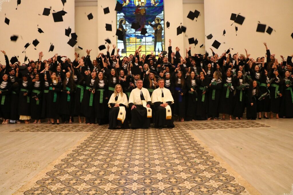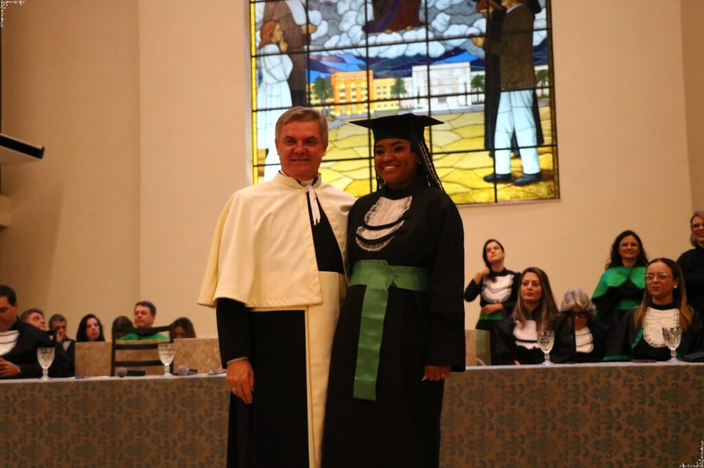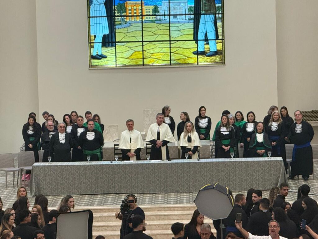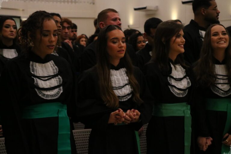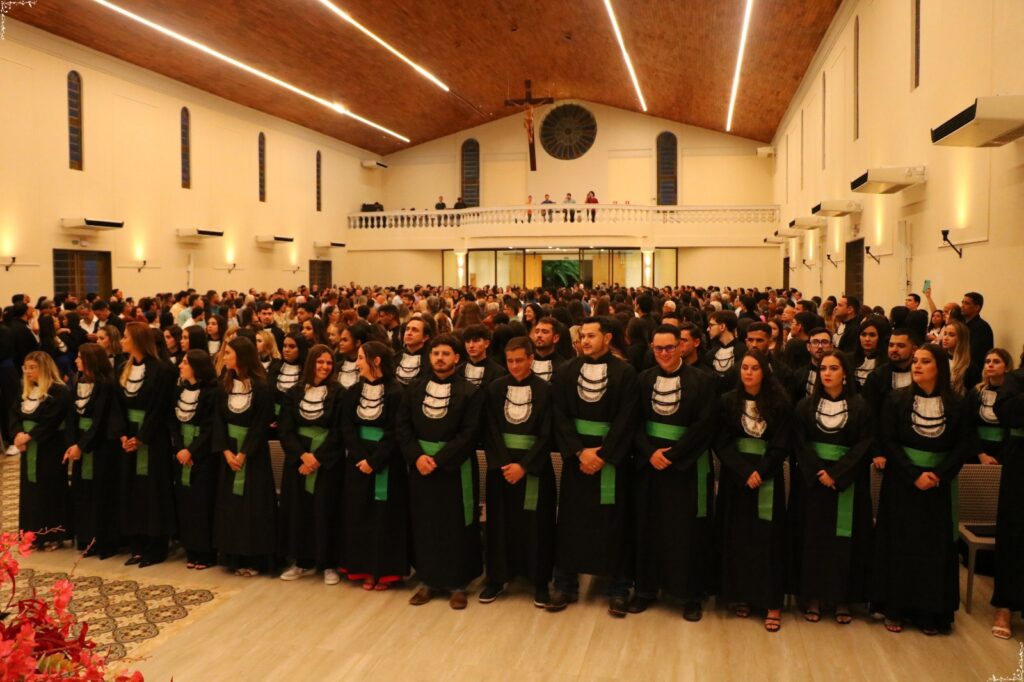 A cerimônia teve início com uma saudação especial aos formandos e seus familiares, reconhecendo o papel fundamental do apoio, do carinho e da dedicação das famílias ao longo da trajetória acadêmica. Em seguida, foram convidados a compor a mesa solene o Pró-Reitor de Ensino, Pesquisa e Pós-Graduação, André Ornellas, o Pró-Reitor de Pastoral, Pe. Paulo Eduardo Jácomo, a Pró-Reitora Administrativa, Vanda Moura, além dos Coordenadores de Curso e docentes da Instituição.