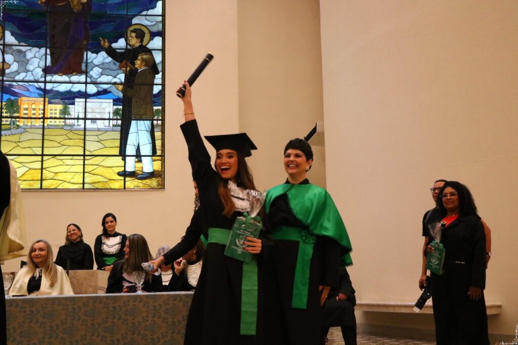 A solenidade também foi marcada pela entrega das medalhas de honra ao mérito aos melhores alunos de cada curso, considerando critérios como desempenho acadêmico, comportamento, participação em atividades institucionais e identificação com os valores do UniSALESIANO. Foram homenageados: Gabriel de Almeida Belini, do Curso de Administração; Tammy Cardoso Serizava Mélles, do Curso de Medicina Veterinária; e Thaís Lumi Hirose, do Curso de Nutrição.