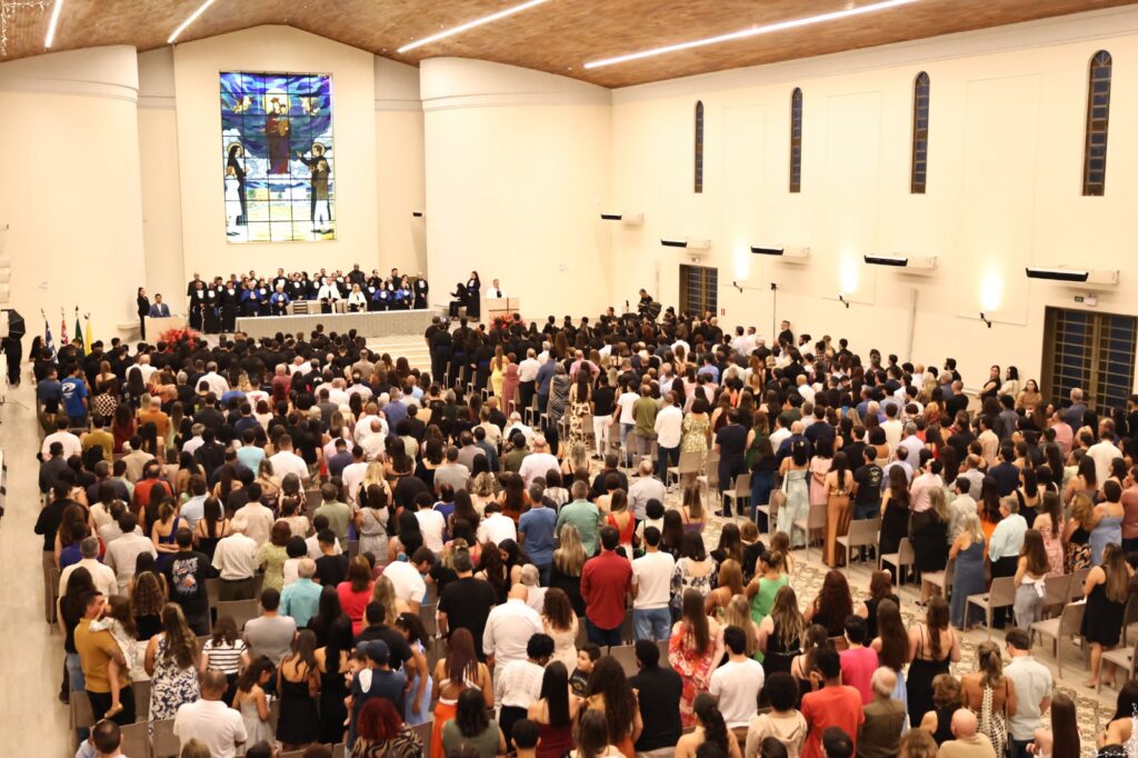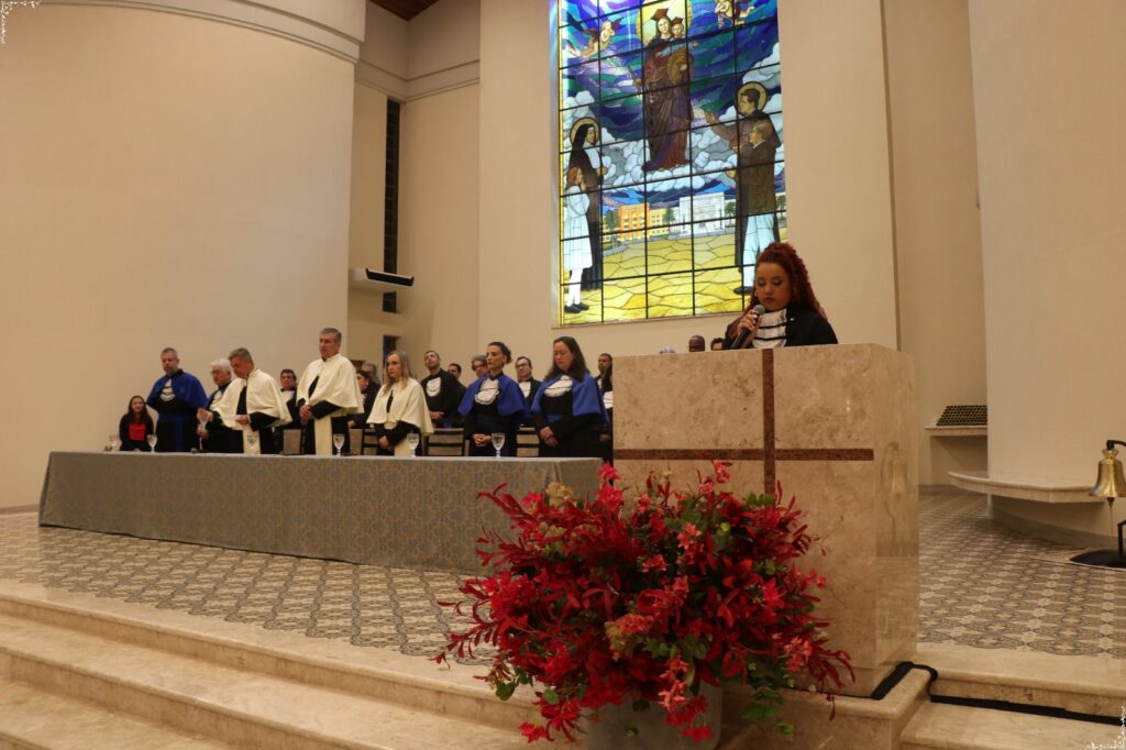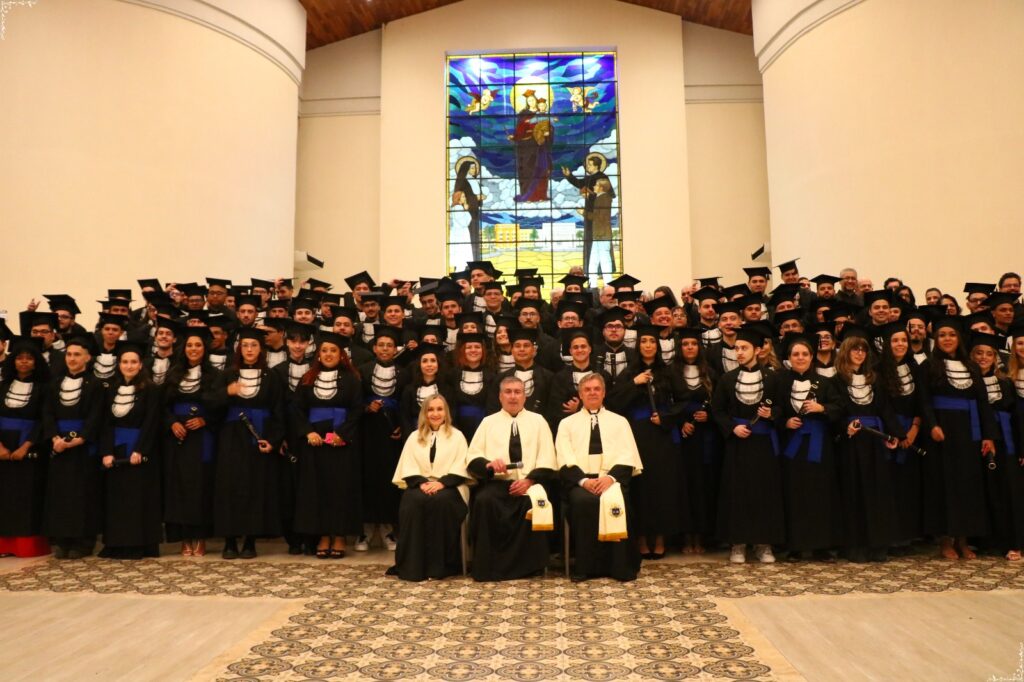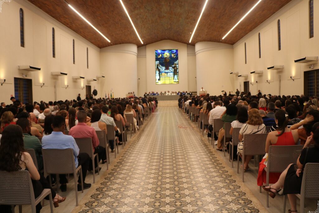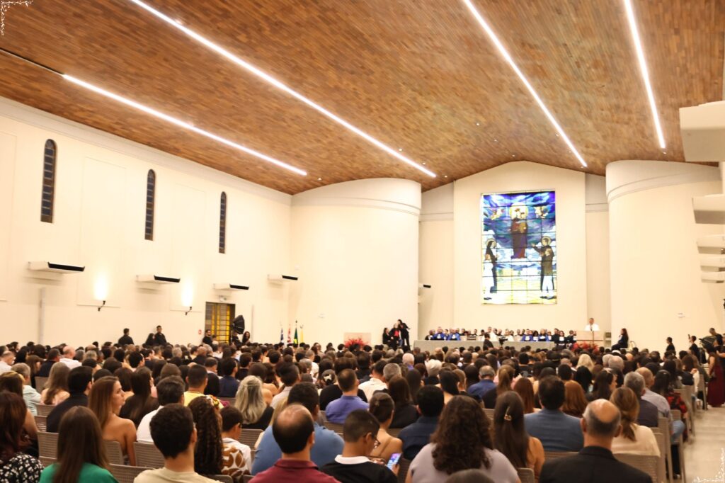 Logo na abertura, a Instituição destacou a importância das famílias na trajetória acadêmica dos formandos, reconhecendo o apoio, o incentivo e a confiança que acompanharam cada passo ao longo da graduação. Na sequência, os formandos realizaram o tradicional cortejo e participaram da celebração religiosa, conduzida pelo Pe. Paulo Jácomo.