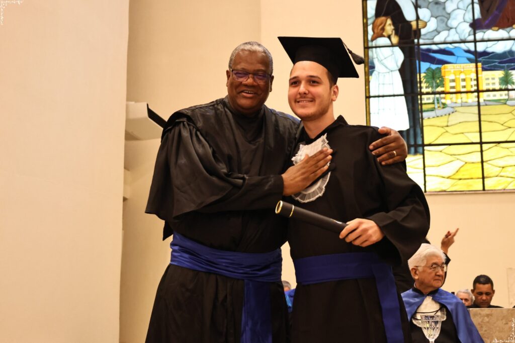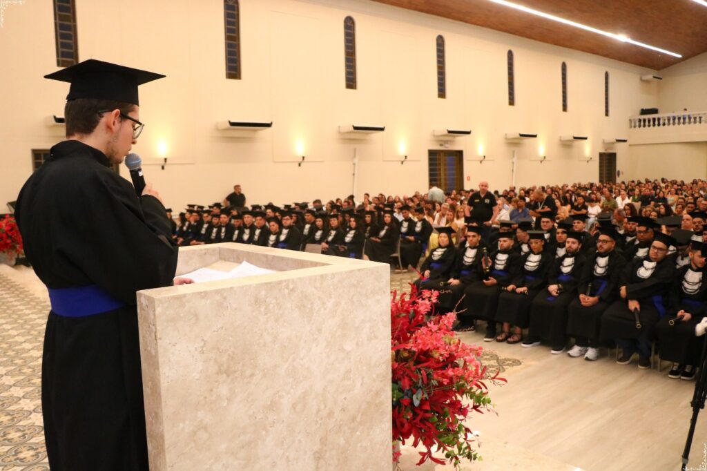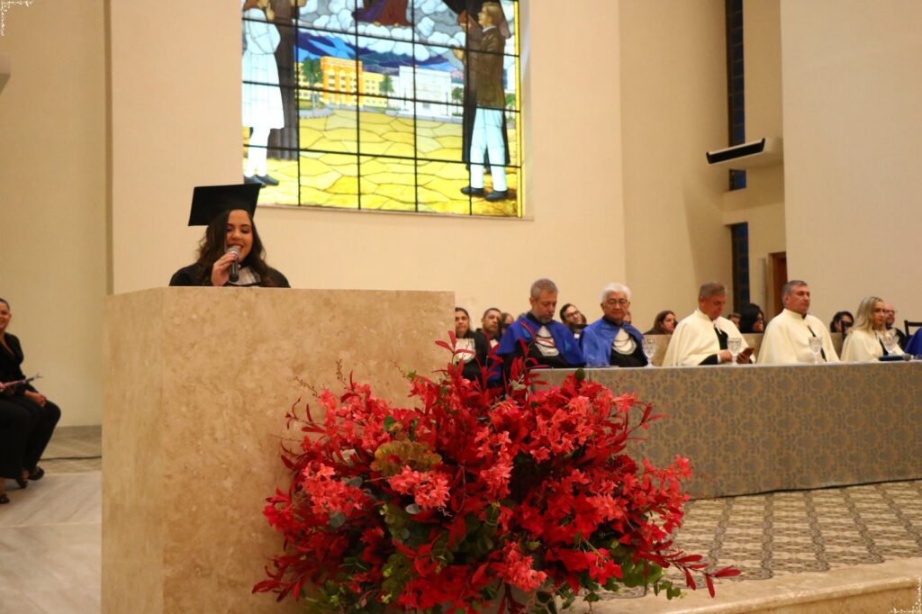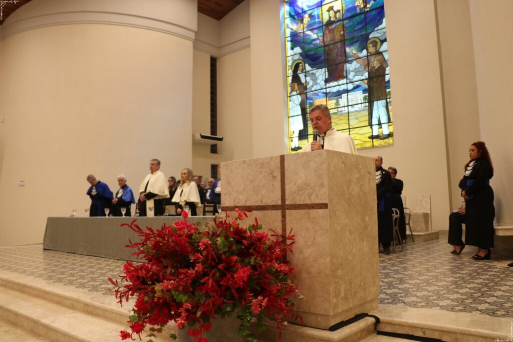 O Pró-Reitor de Pastoral dirigiu-se aos presentes com uma mensagem marcada pela gratidão e pela espiritualidade. Em sua reflexão, ressaltou que a solenidade simbolizava muito mais do que um rito acadêmico: representava a vitória de uma jornada construída com esforço, perseverança e fé. Destacou ainda a presença constante de Deus ao longo da caminhada e a importância de reconhecer o apoio das famílias, dos amigos e, especialmente, dos professores, definidos como instrumentos do amor e da providência divina na vida dos formandos.