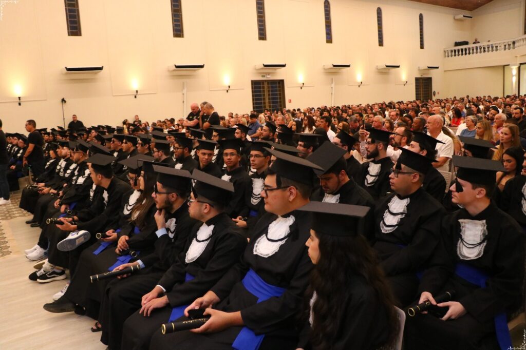 Em seguida, os formandos receberam a imposição do chapéu e os certificados de conclusão, em cerimônias organizadas por curso, acompanhados por paraninfos e patronos.