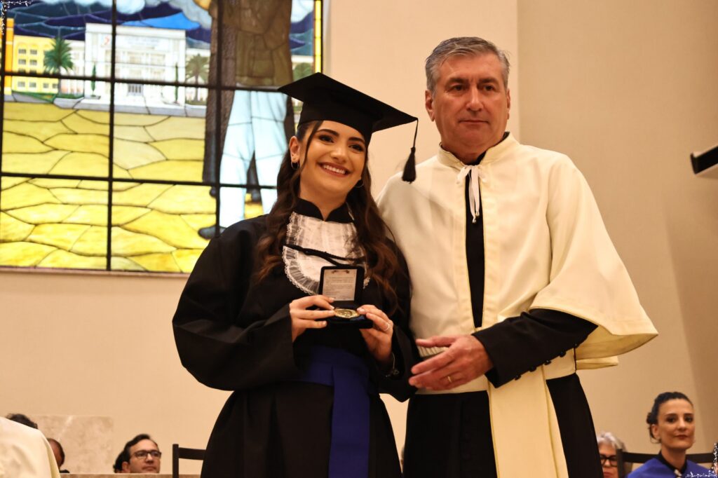 A solenidade também reservou espaço para homenagens aos professores e aos pais, reconhecendo a dedicação, o incentivo e o apoio essenciais para a trajetória acadêmica dos formandos. Outro momento de destaque foi a entrega das Medalhas de Honra ao Mérito, concedidas aos melhores alunos de cada curso, considerando desempenho acadêmico, postura ética, participação institucional e identificação com os valores do UniSALESIANO.