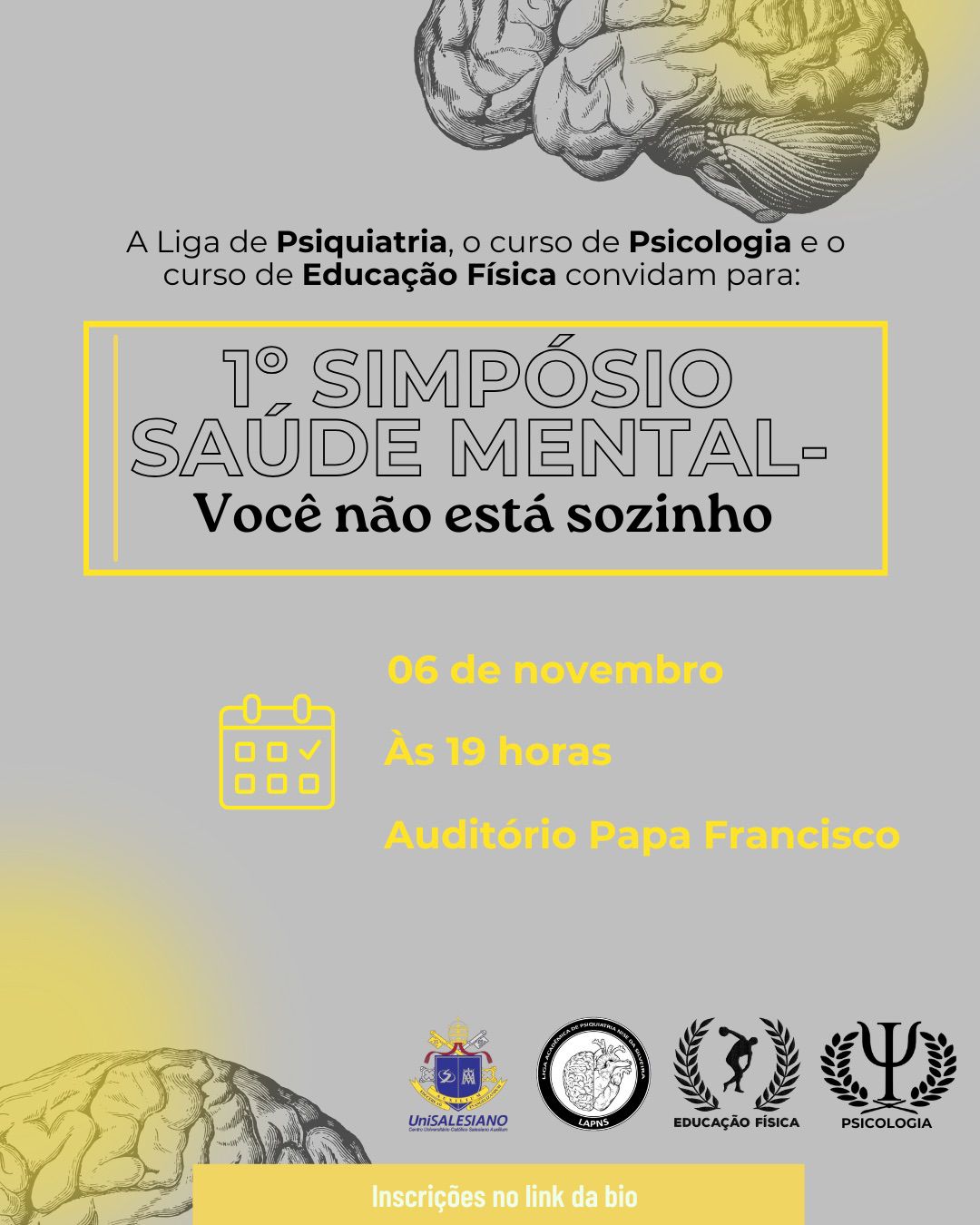 Com o objetivo de promover o diálogo sobre saúde mental e incentivar o cuidado emocional, o UniSALESIANO realizará hoje, dia 6 de novembro, o 1º Simpósio Saúde Mental – “Você não está sozinho”. O evento é uma iniciativa do Centro Universitário, em parceria com a LAPNS (Liga Acadêmica de Psiquiatria Nise da Silveira), do Curso de Medicina, e os Cursos de Educação Física e Psicologia.