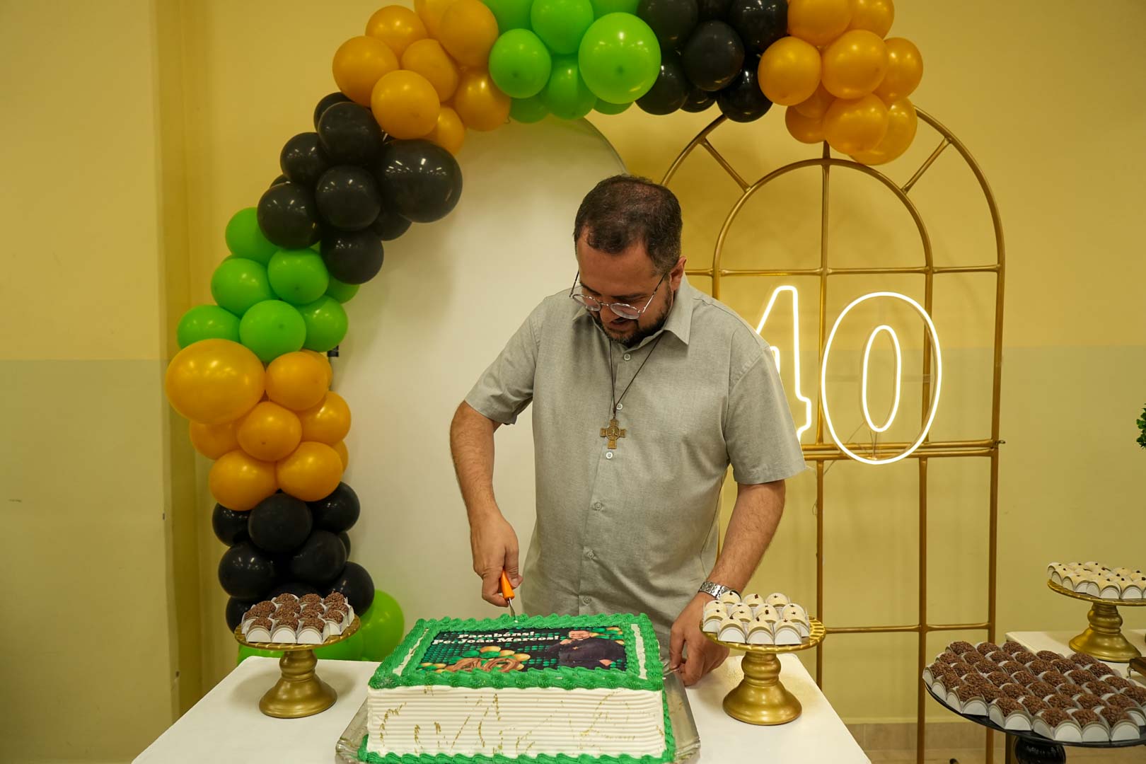 Visivelmente emocionado, Pe. João Marcos agradeceu a todos pela surpresa e pelas manifestações de carinho, destacando a felicidade em celebrar a data ao lado de pessoas tão importantes em sua caminhada. Em seguida, recebeu abraços, presentes e continuou a comemoração junto aos presentes, em um momento de confraternização e alegria compartilhada.