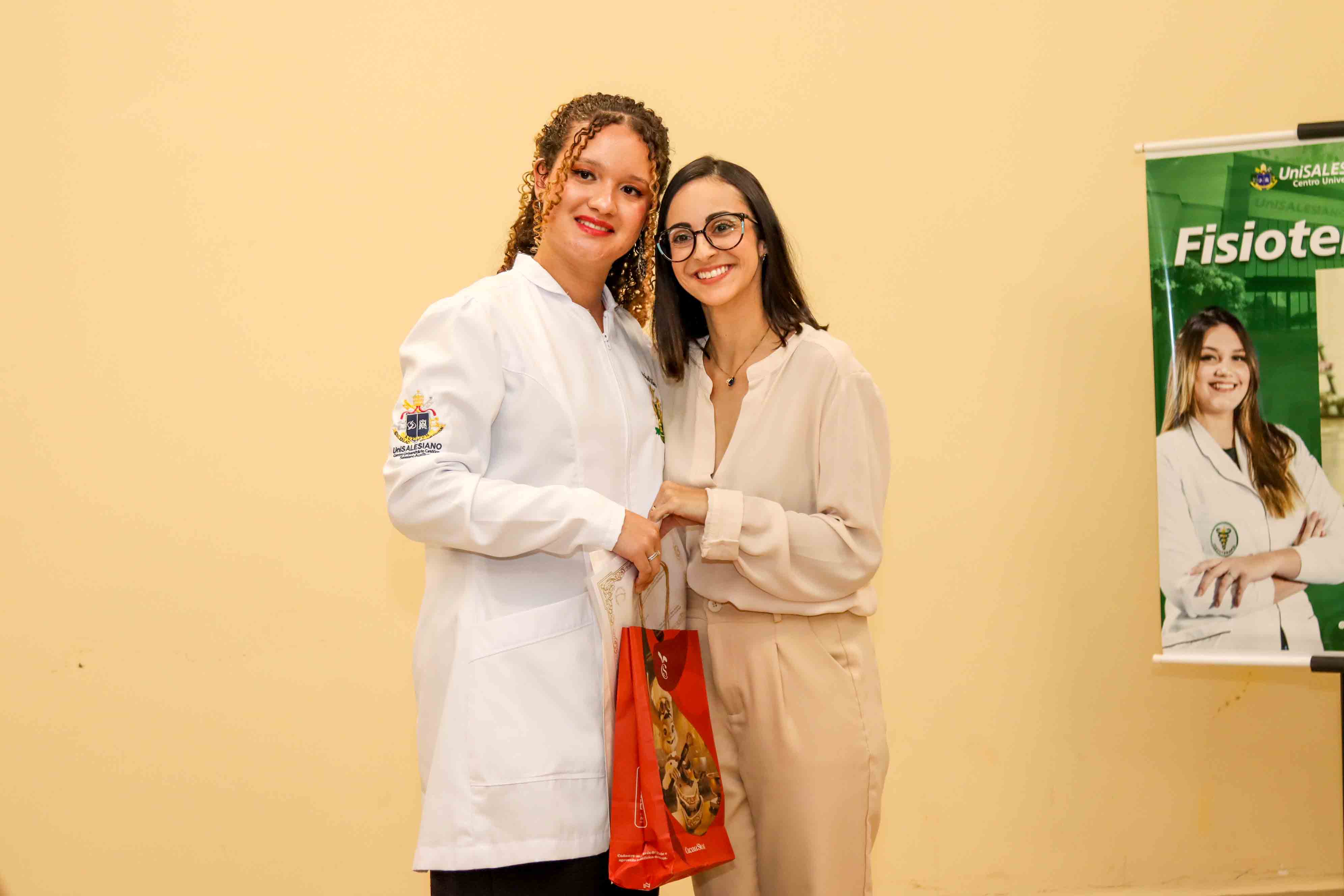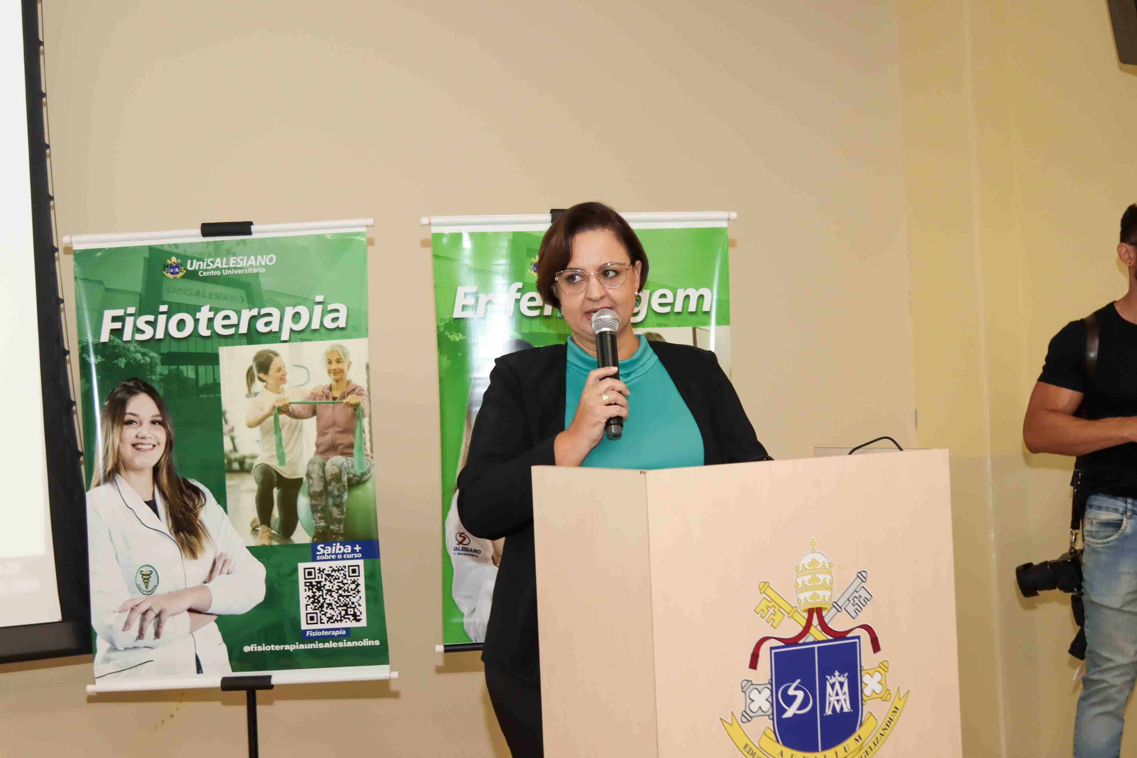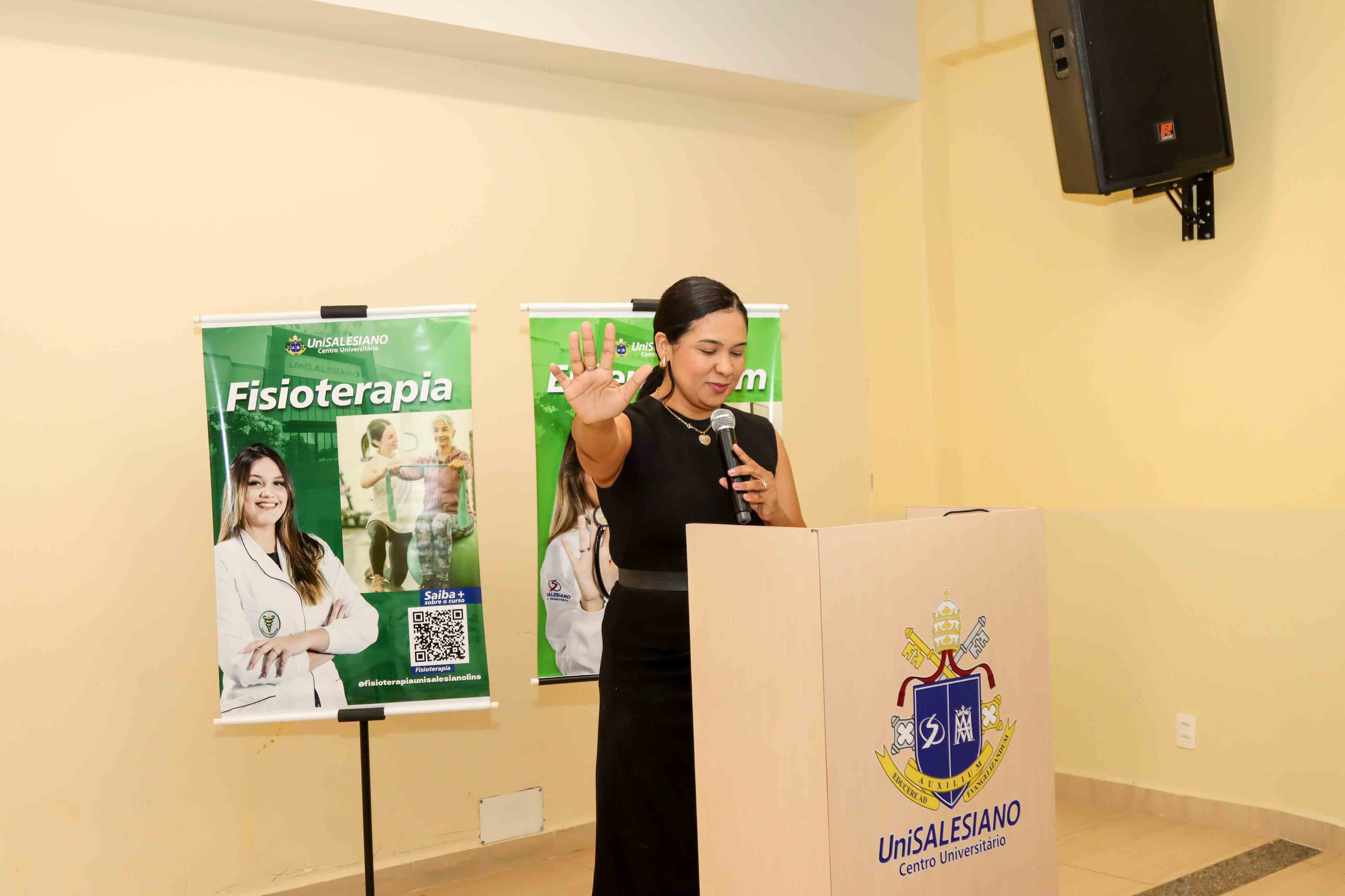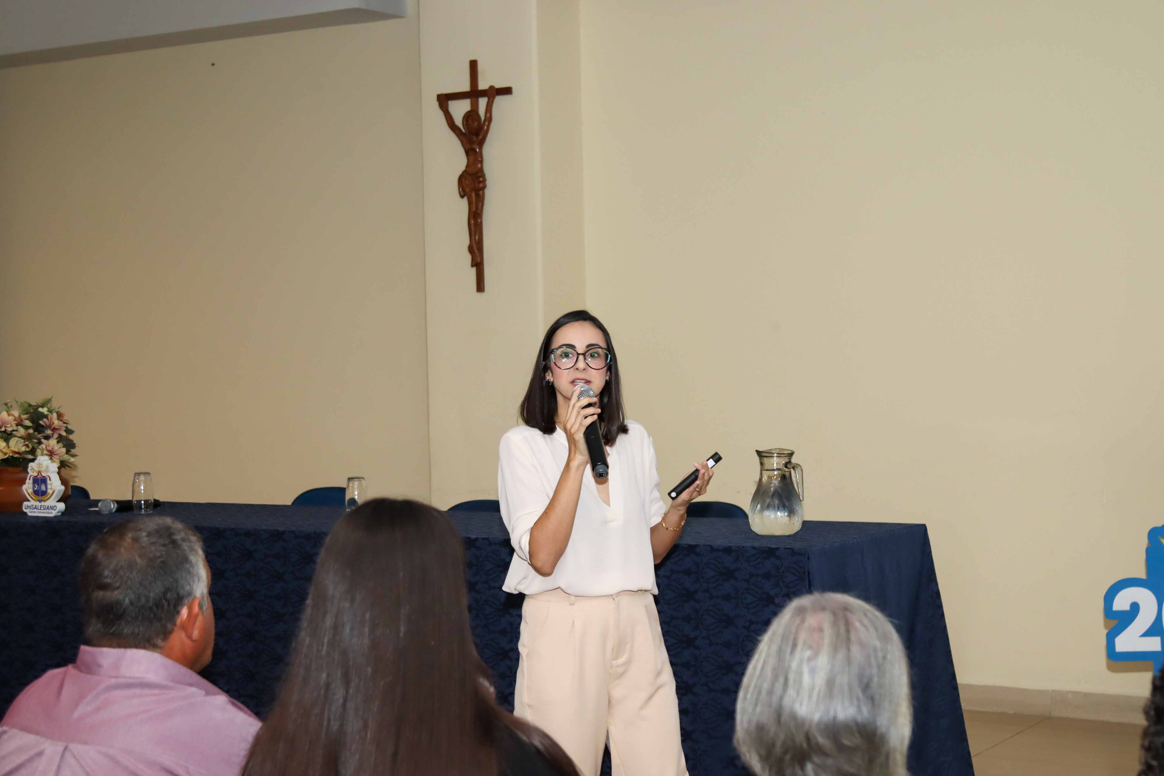 A programação contou ainda com a participação da palestrante Jéssica Eugênio Pessan, ex-aluna do UniSALESIANO que compartilhou sua trajetória acadêmica e profissional, trazendo reflexões sobre o jaleco e o cuidado integral e a importância da saúde mental.