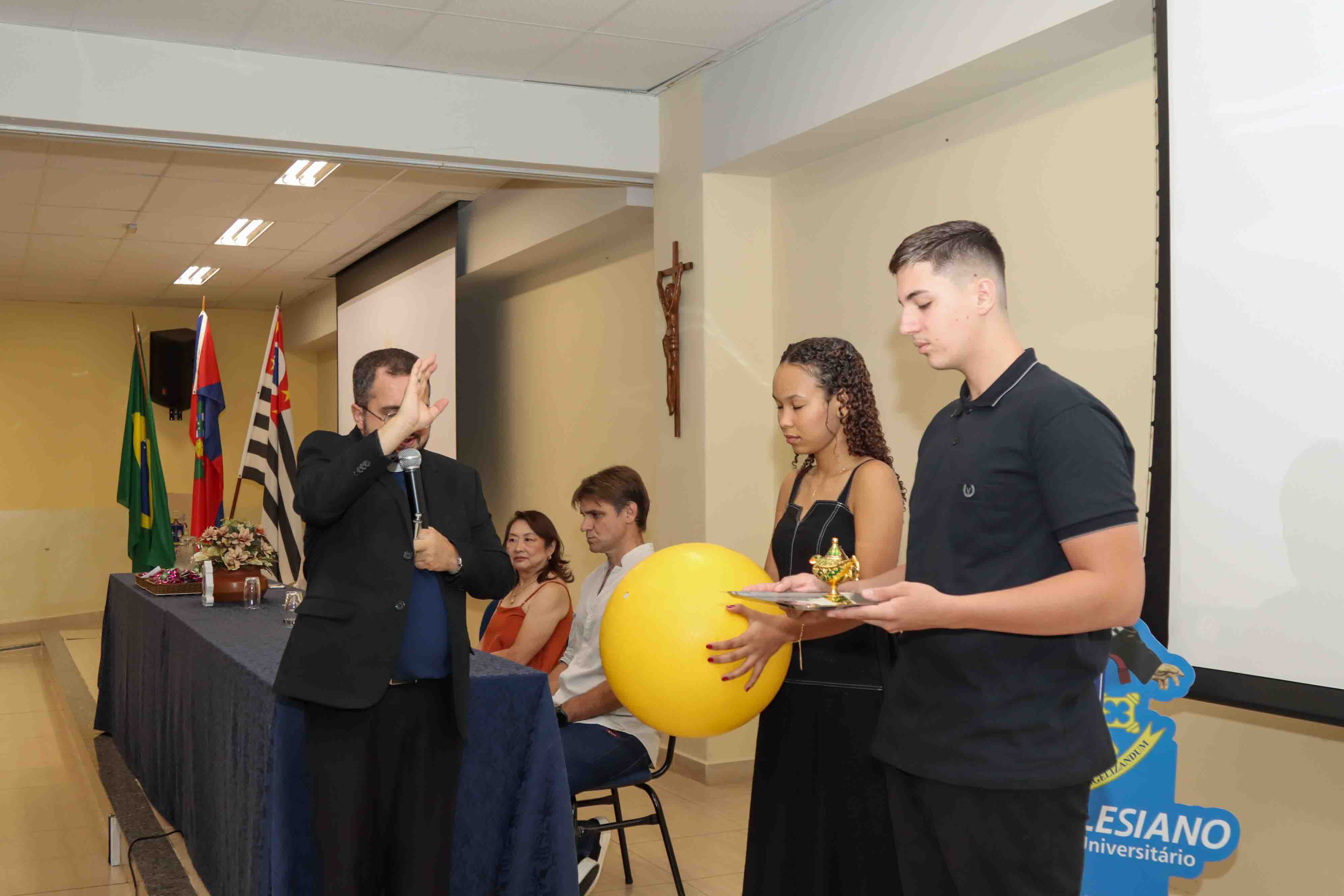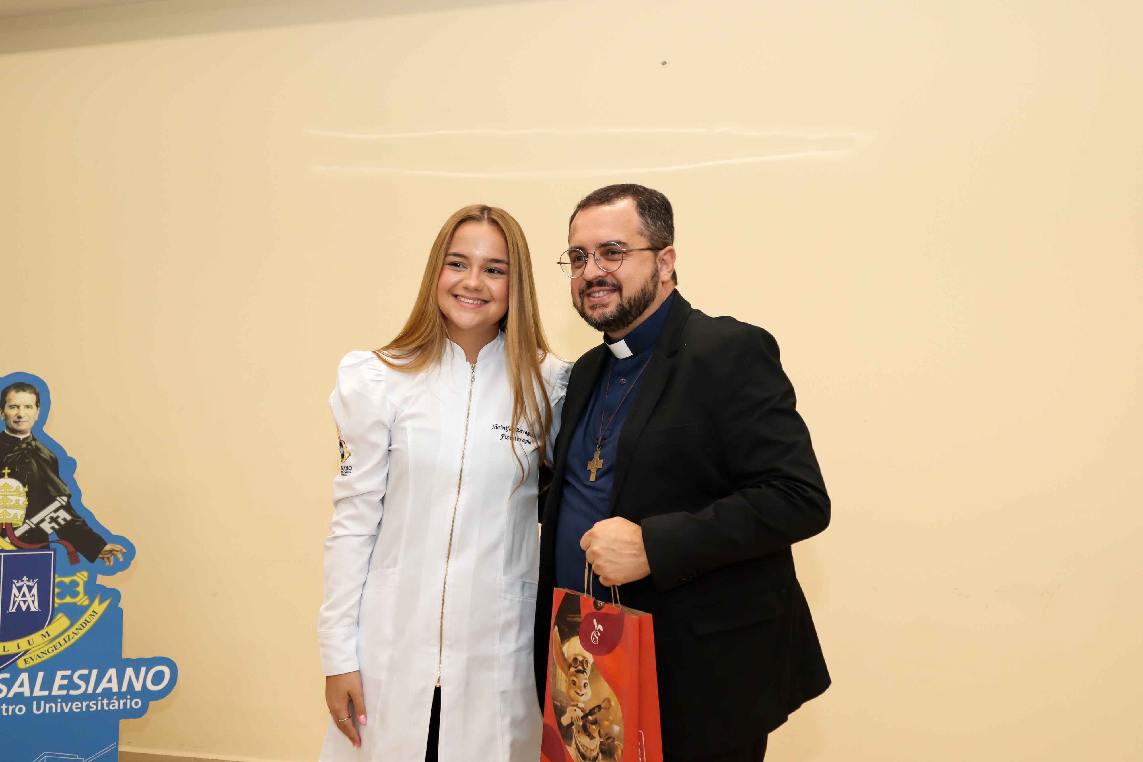 Na sequência, foi realizada a bênção dos símbolos dos cursos, reforçando valores salesianos como responsabilidade, discernimento e empatia, princípios fundamentais para a atuação nas áreas da saúde.