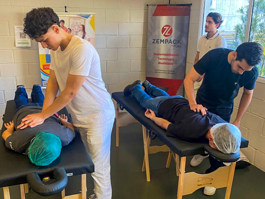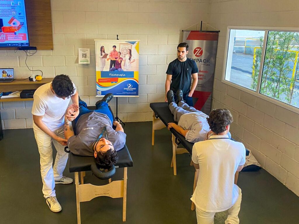 Encerrando as atividades, na quarta-feira, o professor Jonathan Telles acompanhou os alunos em uma visita à empresa Zempack, onde foram realizadas ações práticas de promoção à saúde. Entre elas, Terapia Manual aplicada de forma individualizada, com foco em alívio de dores, melhora da mobilidade e funcionalidade, além de orientações posturais e ergonômicas personalizadas, visando à prevenção de lesões no ambiente de trabalho.