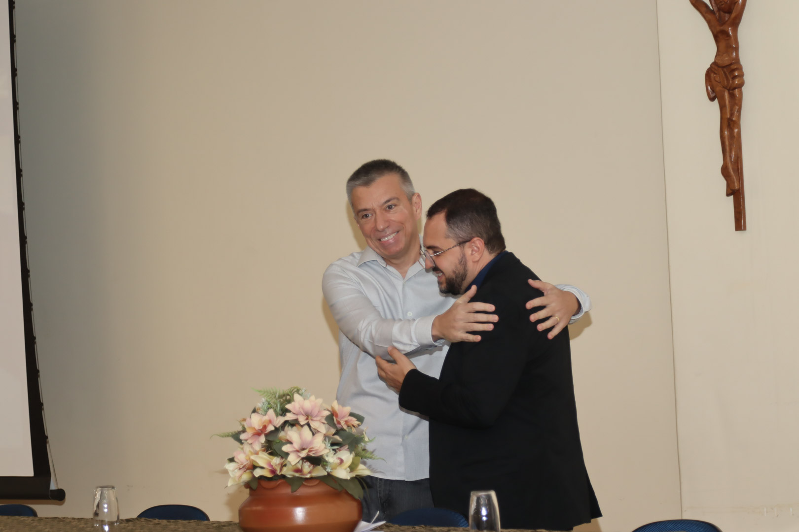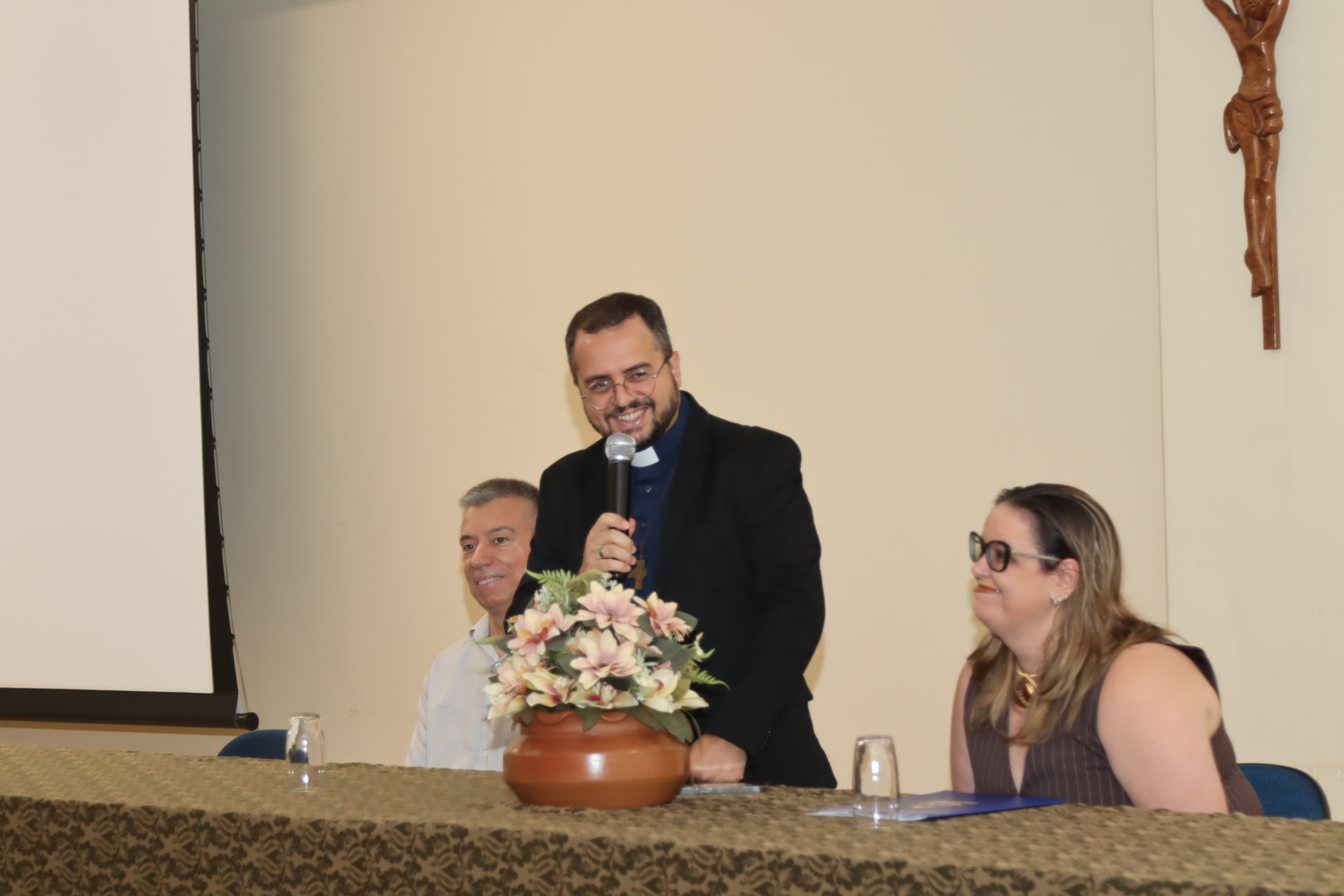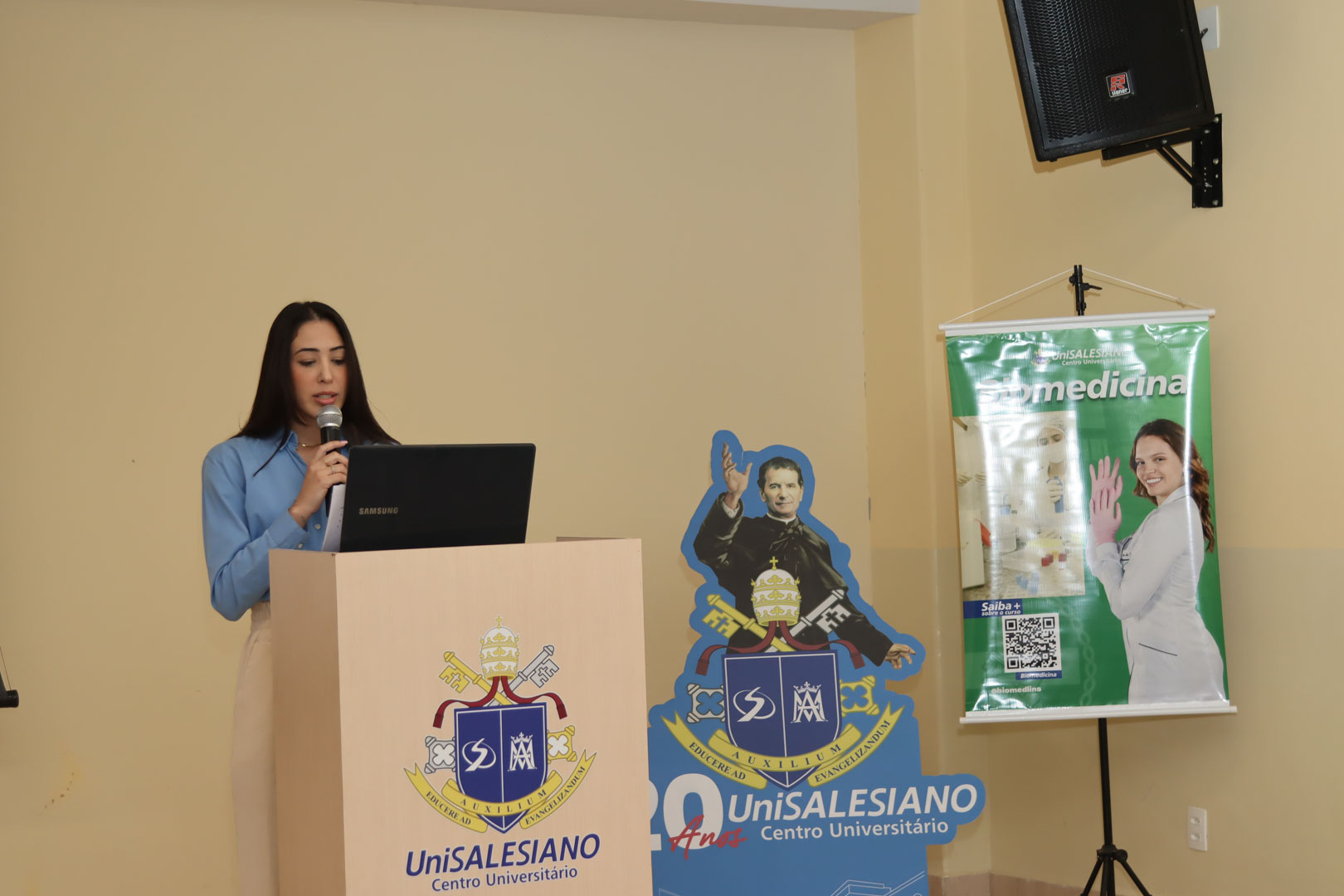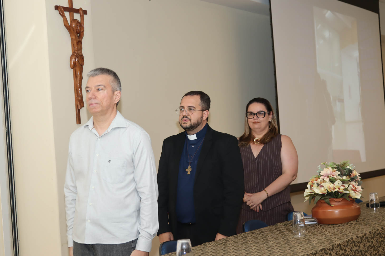 Na abertura solene foi composta a mesa diretora com o Vice-Reitor do UniSALESIANO e Diretor Geral do Campus Lins, Pe. João Marcos Araújo Ramos, o coordenador do curso de Biomedicina, Profº Drº. Silvio Fernando Guideti Marques, representando os docentes, a Profª Drª Luciana Marcatto Fernandes Lhamas e como mestre de cerimônia, a Profª Msª. Edvannia dos Santos Silva.