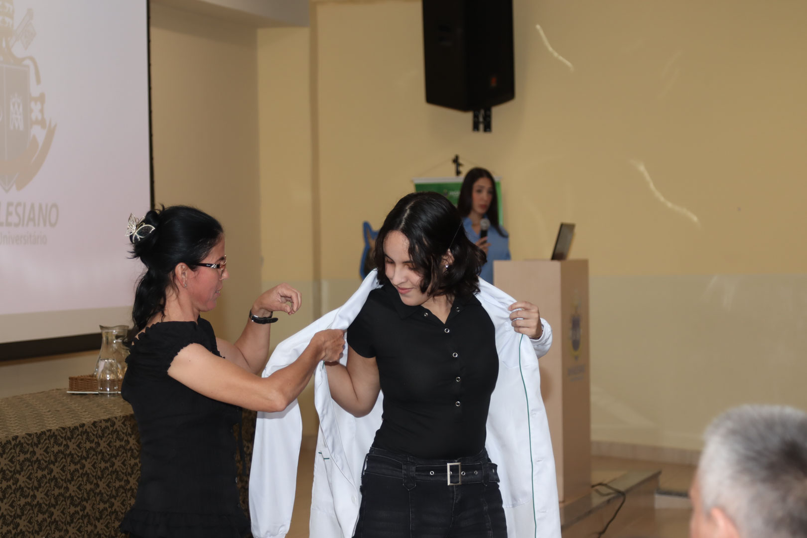 O ápice da noite ocorreu quando o auditório foi tomado por um momento de intensa emoção. Em uma tradição que une gerações, os padrinhos e madrinhas colocaram os jalecos nos acadêmicos.