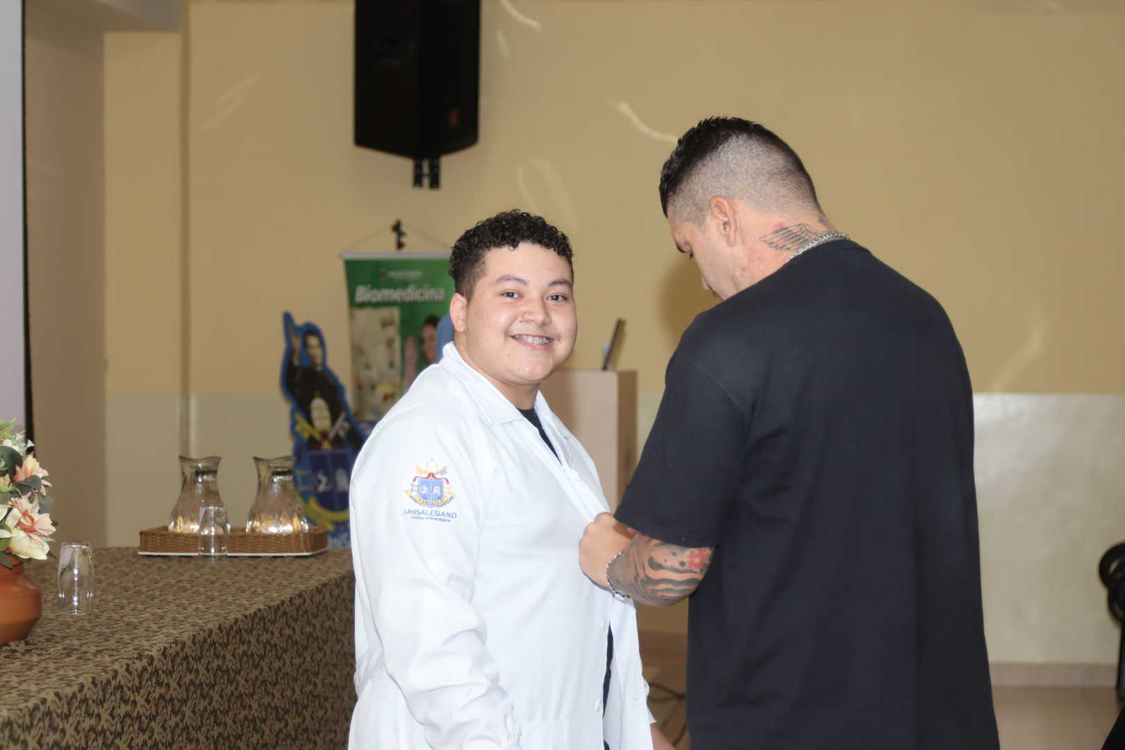 Nesse gesto de carinho e confiança, mãos experientes, muitas vezes de pais, familiares ou mentores, vestiram os jovens estudantes, simbolizando o apoio necessário para enfrentar os desafios da graduação. Lágrimas e sorrisos dividiram o espaço, enquanto o brilho no olhar dos novos acadêmicos denunciava o orgulho de pertencer agora à família da Biomedicina.