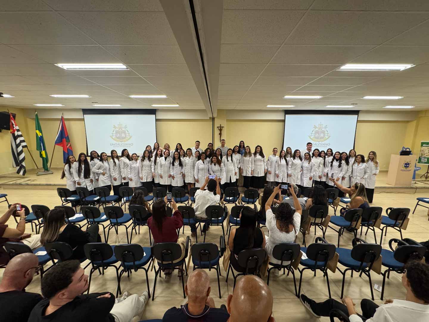 Na última sexta-feira, dia 20, em uma atmosfera de entusiasmo e compromisso com a saúde e ciência, acadêmicos do 1º semestre do curso de Biomedicina participaram de um dos momentos mais aguardados do início de sua trajetória universitária: a Cerimônia do Jaleco.
