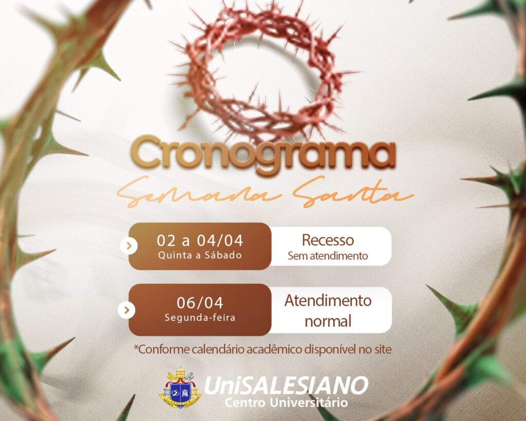 Neste momento de fé, reflexão e renovação, o UniSALESIANO informa que, conforme o calendário acadêmico, estará em Recesso de Páscoa nos dias 02, 03 e 04 de abril.
