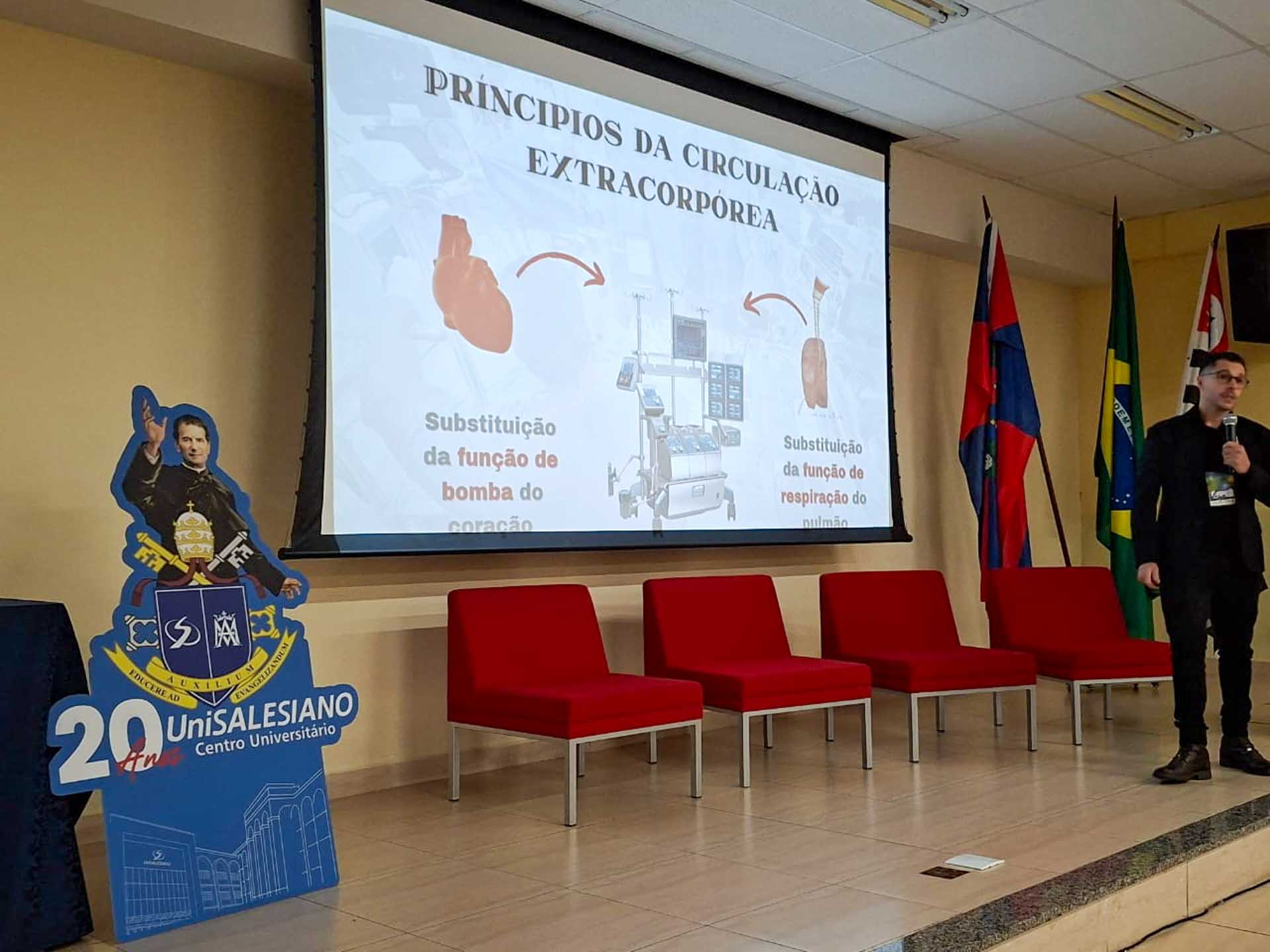 Em seguida palestrou o Drº Henrique Schiller de Lima Júnior, que abordou sobre o tema “O Universo da Circulação Extracorpórea” onde, certamente, tivemos o ponto alto do evento. Com uma oratória envolvente e domínio técnico impecável, ele mergulhou no universo da perfusão extracorpórea, desvendando a complexidade das máquinas que assumem as funções vitais do paciente durante os procedimentos mais delicados. Enquanto explicava a dinâmica das cirurgias cardíacas, destacou que o sucesso no centro cirúrgico vai muito além do bisturi; depende da precisão absoluta e do controle emocional que definem a vida do perfusionista. Esse profissional, muitas vezes atuando nos bastidores, é o guardião do equilíbrio fisiológico enquanto se realiza o transplante. Ao final da apresentação, a plateia ficou encantada com o tema, reconhecendo não apenas a evolução tecnológica da área, mas a humanidade e a dedicação necessárias para manter a vida pulsando através da tecnologia.