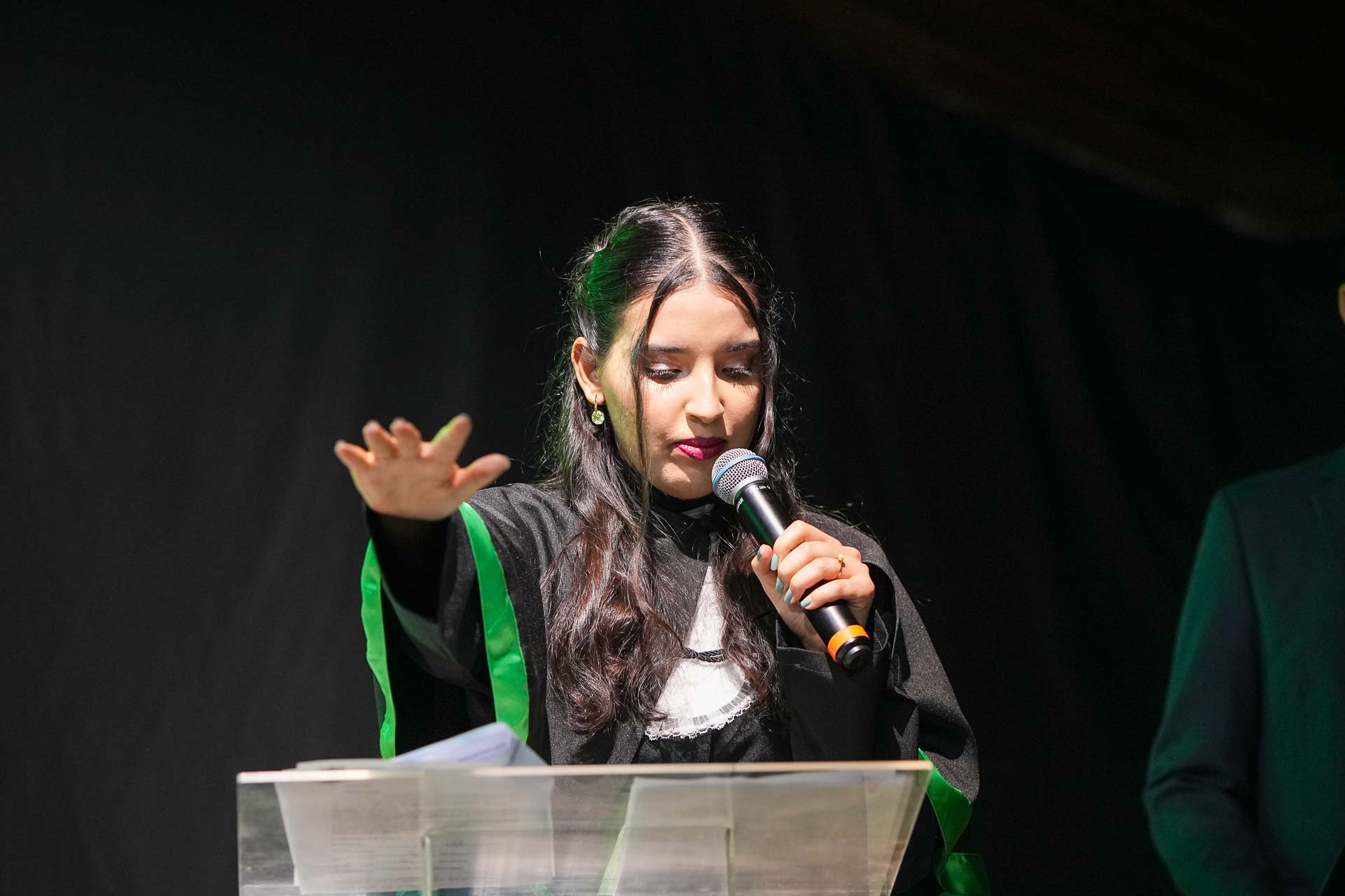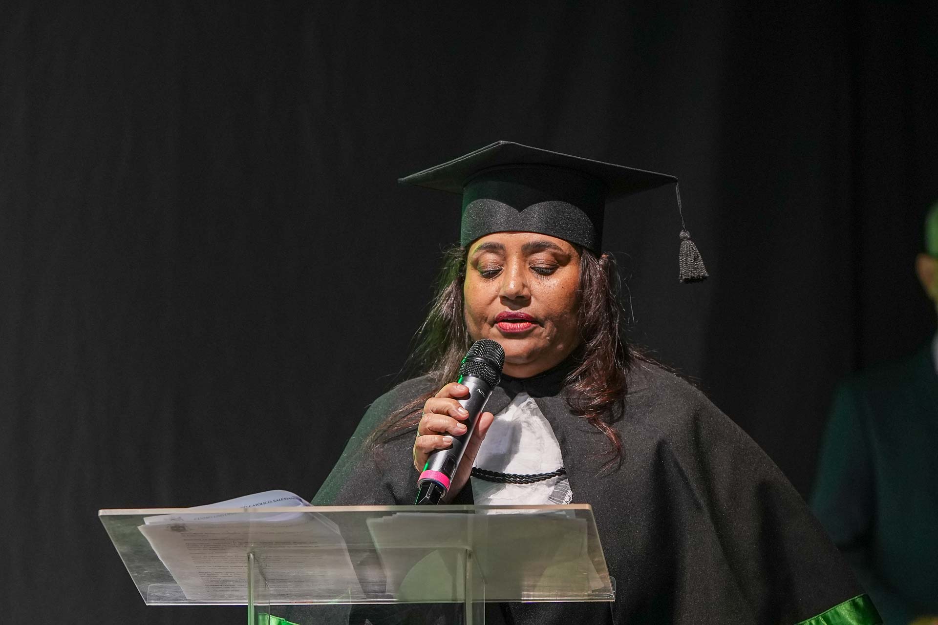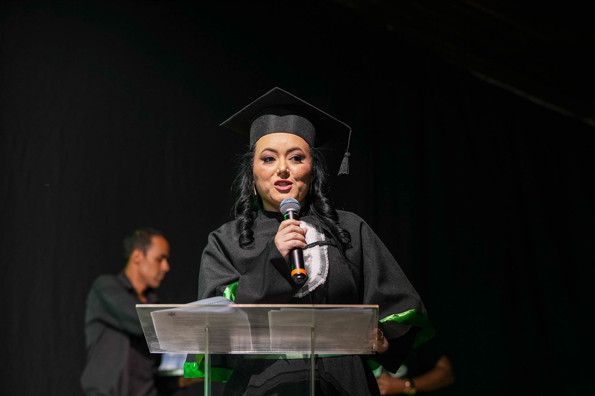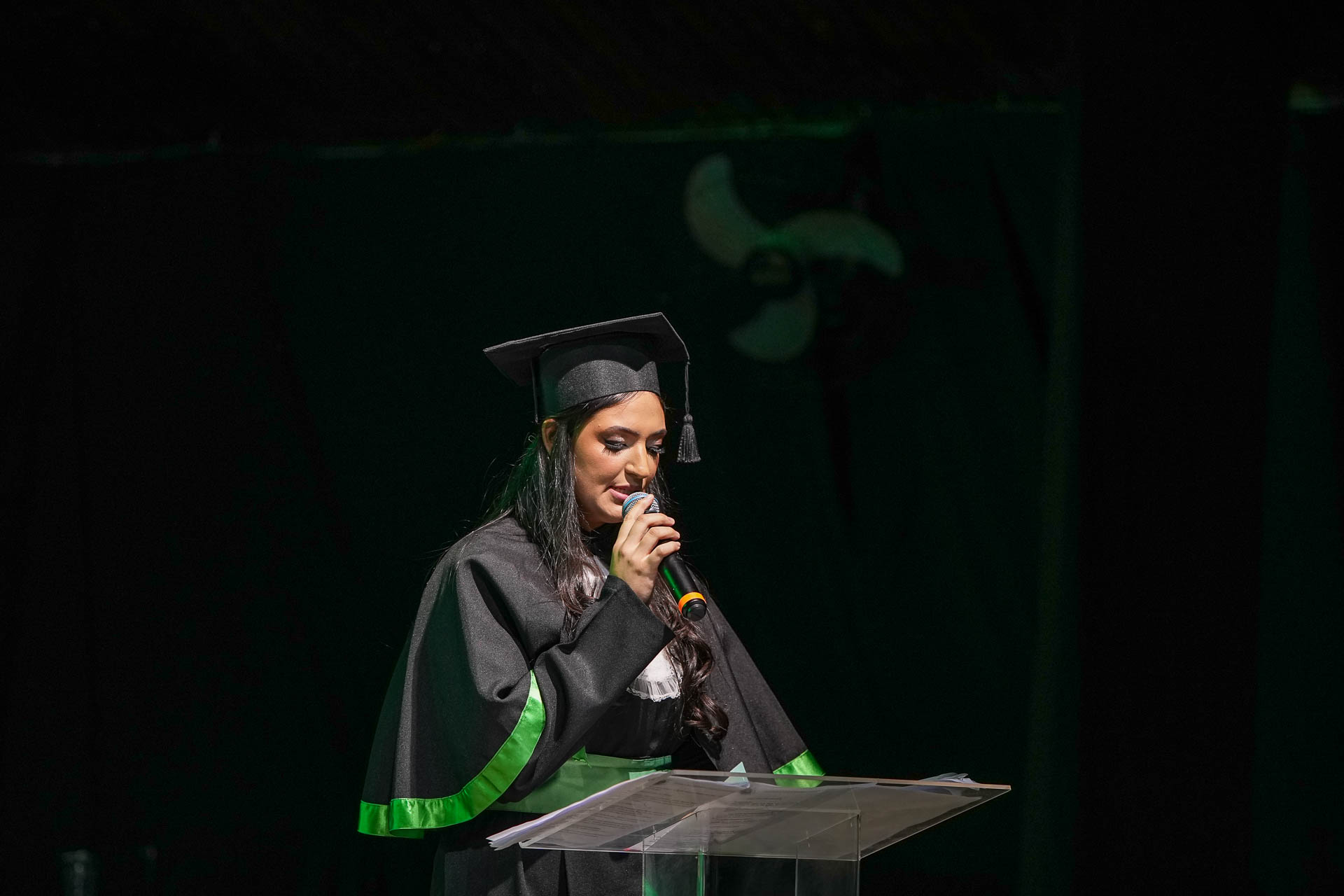 Representando as turmas, a formanda do curso de Enfermagem, Bruna Fernandes, proferiu o discurso como oradora, destacando a vocação para o cuidado, os desafios enfrentados ao longo da graduação e a responsabilidade ética e social que marca a atuação dos profissionais da saúde.