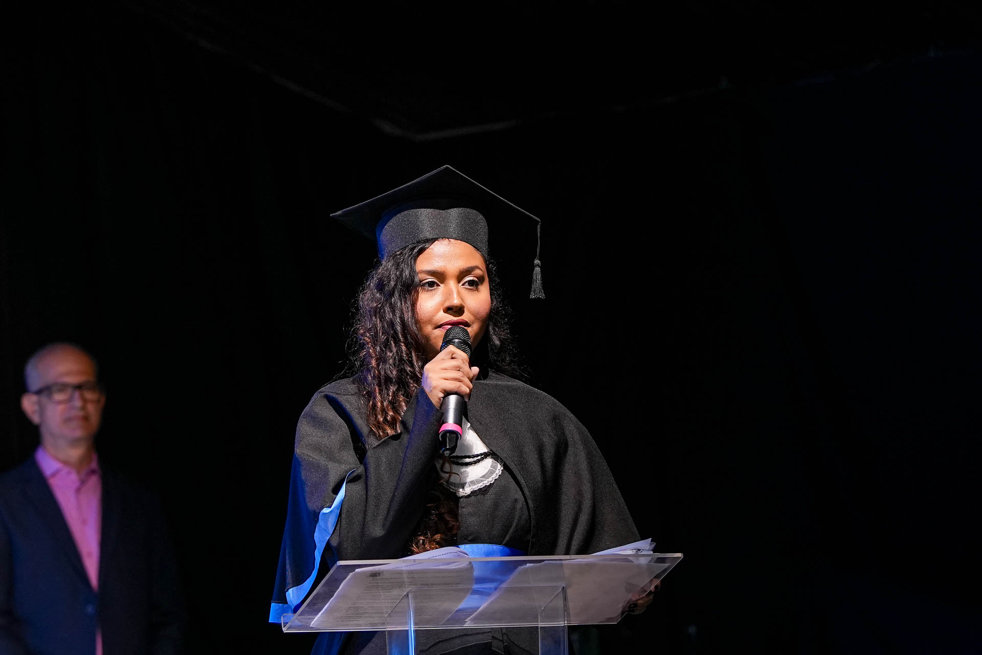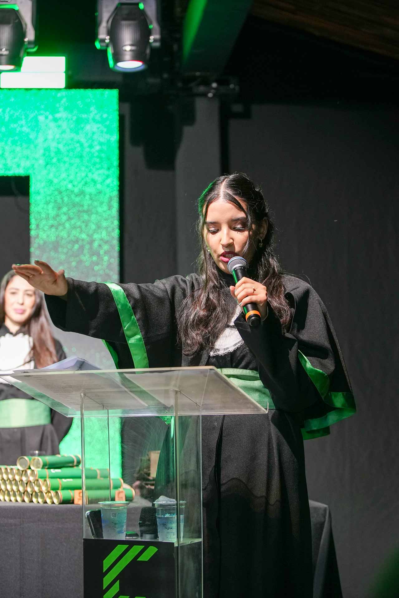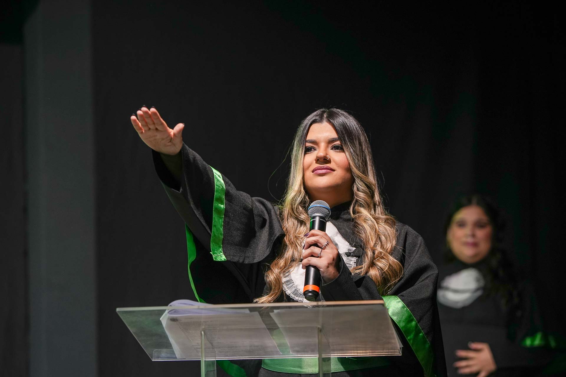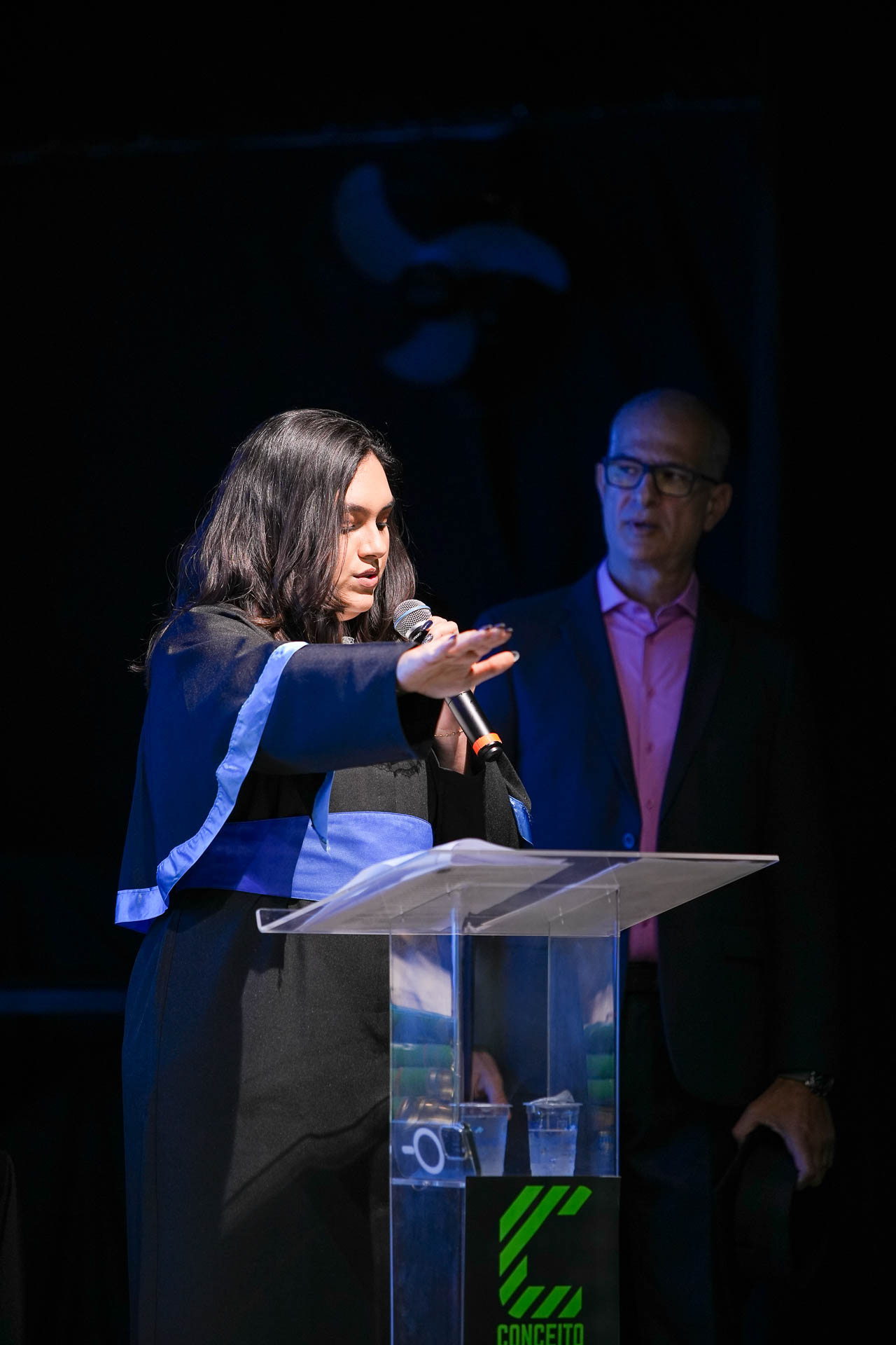Representando as turmas, a formanda do curso de Enfermagem, Bruna Fernandes, proferiu o discurso como oradora, destacando a vocação para o cuidado, os desafios enfrentados ao longo da graduação e a responsabilidade ética e social que marca a atuação dos profissionais da saúde.